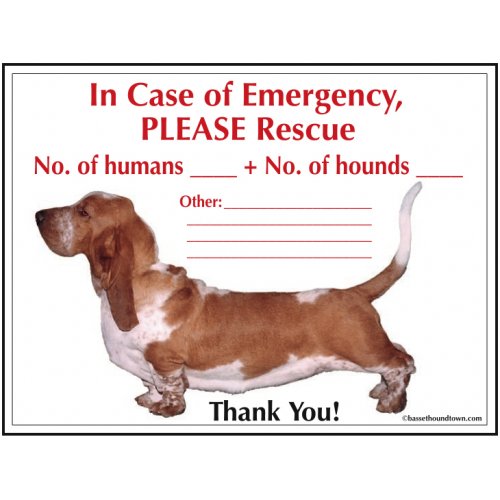 Description: Your Mayor wants everyone to be safe in our town. Chaps stands at attention so rescue workers can see what a basset hound looks like. A nano second glance will let any resuce worker know of all loved ones inside your home. You can print this poster at any percentage you like. Also, for durability you can take it to your local office suppy place and get it laminated. You can use a sharpie on the laminated material. Use a bit of windex to make corrections. Makes a great gift as well! May I present: In Case of Emergency Poster - FREE